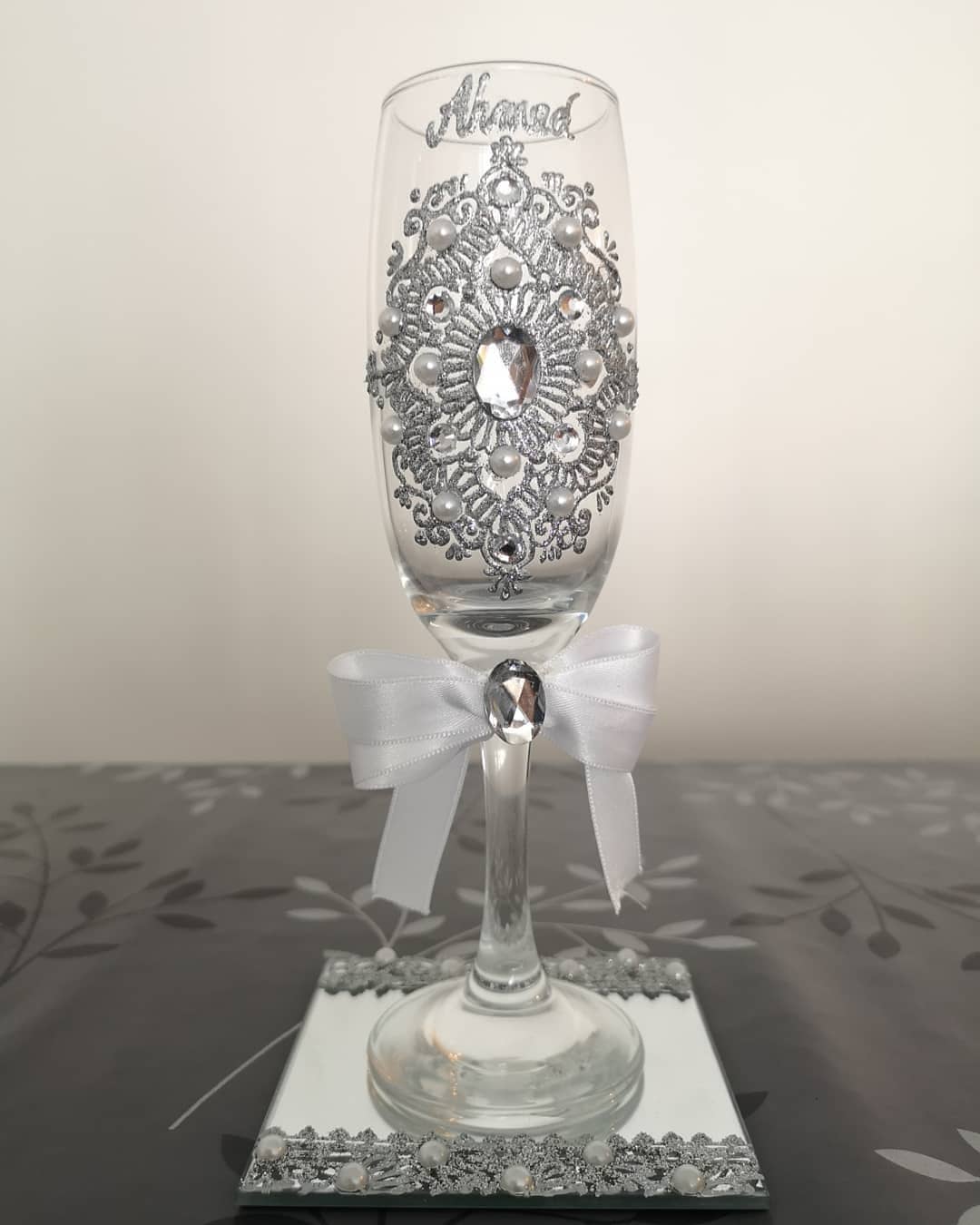 Découvrez nos Flûtes Royal, une paire d’élégantes flûtes, prêtes à être transformées en un véritable chef-d’œuvre personnalisé pour les mariés ou les fiancés. Chaque flûte devient une toile artistique, attendant l’éclat magique de vos prénoms.